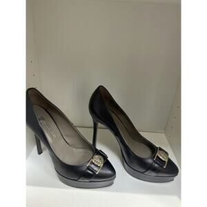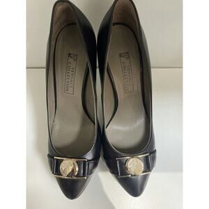 Elevate your style with these Versace Collection black leather platform pumps. These sophisticated pumps feature an elegant black leather upper adorned with a gold-tone Medusa medallion, adding a touch of luxury. The pointed toe design and platform sole ensure both style and comfort, while the stiletto heel provides a flattering lift. These pumps are in gently used condition, showcasing minor signs of wear. Made in Italy, they are perfect for formal occasions and any sophisticated look.