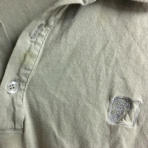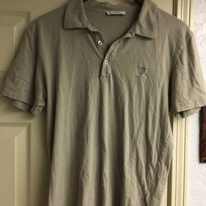 Polo Shirt, lightly worn, color is somewhere between green and tan mixture. No major stains or tears visible.