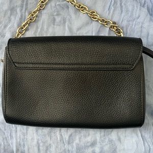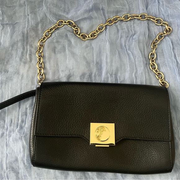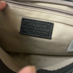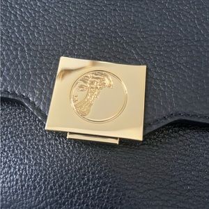 Versace face hardware is in perfect condition. Leather is in perfect condition; no scuffs or scratches. Inside of hardware still has some of its protective film (see pics). Has a few really light stains inside (see pics). Chain can be removed and used as a wristlet.