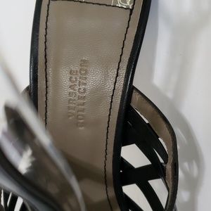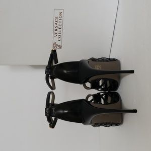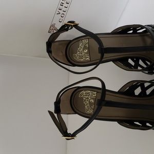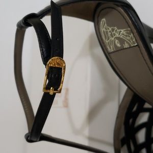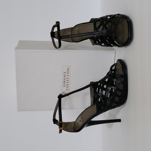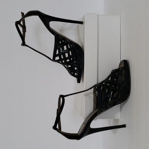 Description: Caged Leather T Strap Sandals with Ankle Strap Buckle Closure; Stiletto Heel