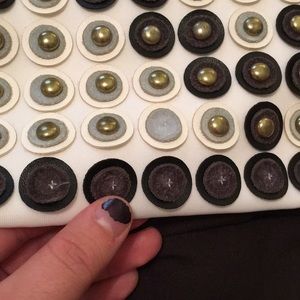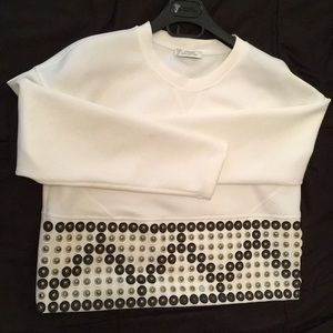 This item is gently used! Minor stains on sleeves and on front of top, a few of the metal bullets on the bottom of top are missing. All wear and tear is pictured. Make me an offer if you like this item! I’ll entertain anything! Comes with Versace hanger and garment bag.