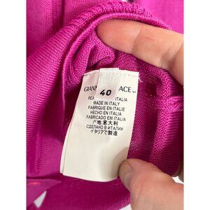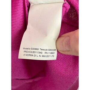Elevate your wardrobe with this Versace Collection vibrant pink knit cardigan. Featuring a button front, crew neck, and unique back open braid detail, this 90% wool and 10% viscose piece combines luxury with comfort. Perfect for adding a touch of elegance to any ensemble.