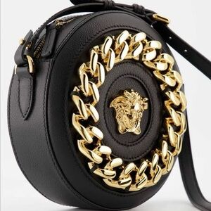 Grained calfskin shoulder bag in black. Signature Medusa hardware and curb chain in gold-tone at face. Detachable and adjustable shoulder strap · Zip closure · Patch pocket at interior · Tonal cotton twill lining. Gold-tone hardware · H7 x W7 x D2