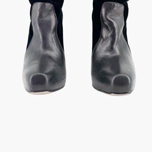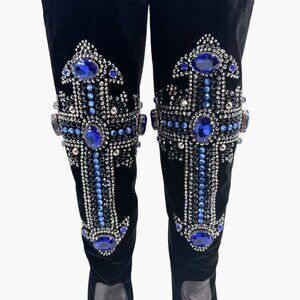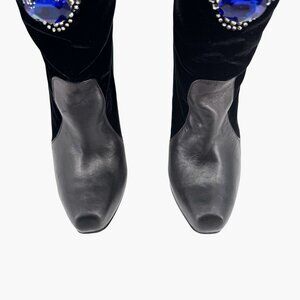 These Versace knee-high boots are the ultimate statement piece, blending Western style with high-fashion edge. The luxurious black velvet shaft is adorned with a stunning blue and silver crystal-embellished cross, adding a bold and opulent touch. A sleek black leather upper and squared almond toe give these boots a structured, modern edge, while the hidden platform and high block heel provide elevated height and stability. With a pull-on design for effortless wear, these boots are perfect for upscale events, evening outings, concerts, and adding a dramatic flair to fall and winter wardrobes. The metallic leather outsole adds a final touch of signature Versace luxury.