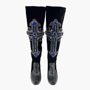 Versace Crystal Cross Knee High Boots EU 37 US 7 Black Velvet High Heel Platform