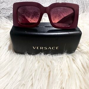 Elegant Versace sunglasses in deep red. Features gold logo detailing. Ideal for a sophisticated style.