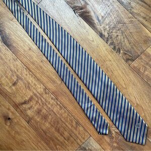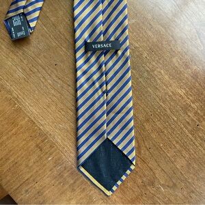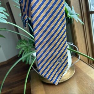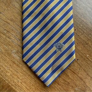 Versace Diagonal Striped Repp 100% Silk Tie in Blue and Gold with Logo. Elevate your style with this elegant striped tie featuring a classic blue and yellow design. Perfect for any formal occasion. 100% silk. Made in Italy. Great preowned condition.
