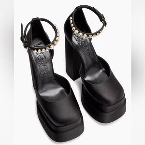 Chunky block heel and stacked platform elevates these satin-covered pumps, detailed with crystal embellishments and Medusa charm at ankle strap.