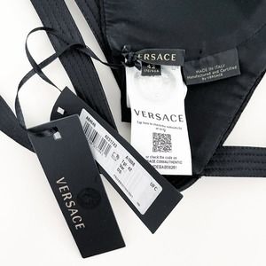 From the 2019 Fall RTW Versace Collection. Silk satin cage bra top in black. Quilted detailing throughout. Adjustable crisscrossing straps with pin-buckle fastening at shoulders. Padded cups. Adjustable straps with pin-buckle fastening at front. Hook-eye fastening at back. Engraved gold-tone hardware. New with tags.