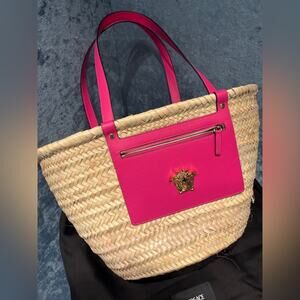 This stylish Versace tote features a tan woven texture, pink accents, and the iconic Medusa detail. Crafted with a straw body and a leather Medusa centerpiece, this bag offers a chic and timeless design.