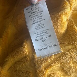 Authentic Luxurious Unisex Versace robe in gold with embossed logo. Features intricate black and gold cuffs. This robe is used and is in need of being cleaned. It is authentic and priced to go with you. Please see pics to authenticate.