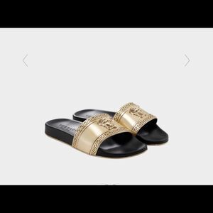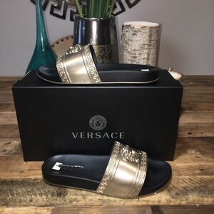 Stylish Versace sandals. Gold strap with iconic Medusa emblem. Comfortable black sole.