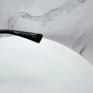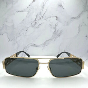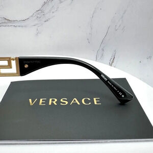 Elegant Versace sunglasses. Gold frame with black lenses. Stylish geometric design on arms.