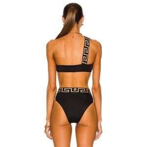 Featuring a one-shoulder neckline, signature Greca elastic band, and a sleek, minimalist silhouette. One-shoulder style. Slip-on design. Unpadded for a natural shape. Smooth stretch fabric for comfort and support. Material: Self & Lining: 78% Polyamide, 22% Elastane. Trim: 82% Polyester, 9% Elastane, 9% Polyamide. Made in Italy. Hand wash. Fits true to size