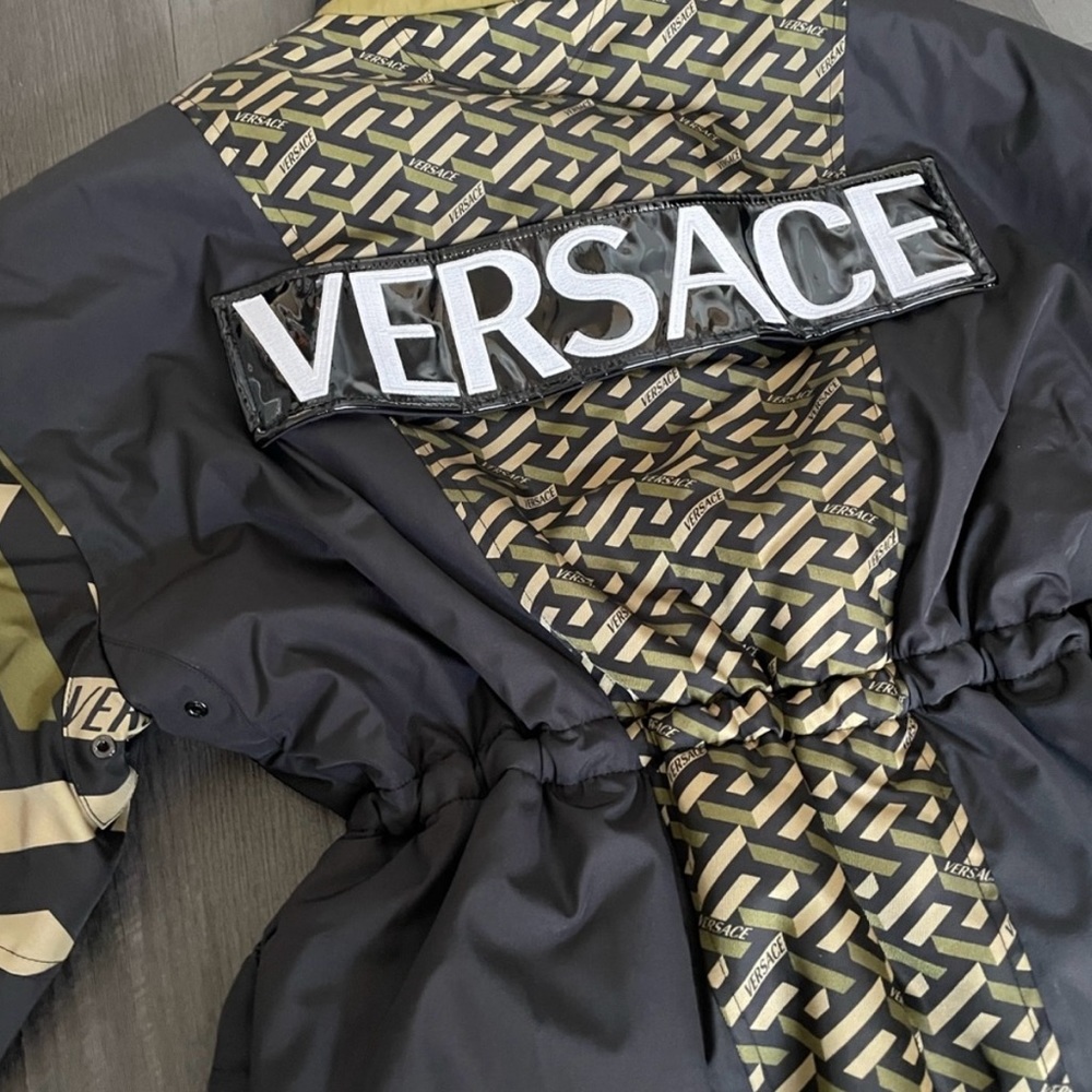Stylish Versace LA GRECA PRINT Utility jacket with VERSACE written on back embroidered into a patent leather flap. Patent leather flaps on front of jacket as well gives a stylish look to it. This jacket is SOLD OUT everywhere. Inside the jacket there is an authentication QR code. This jacket cost me $3100 with tax from Nordstrom. So this is an amazing deal and please, no low ball offers. I will automatically decline.
