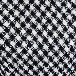 Made from wool tweed in a checked pattern. The design is complete with frayed detailing, short sleeves, and side pockets.