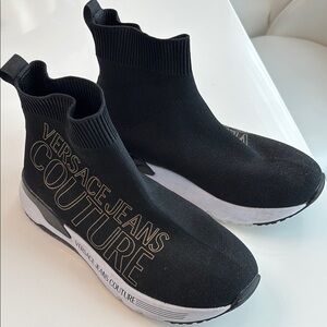 Chic black sock sneakers with bold Versace Jeans branding. Sleek and modern design.
