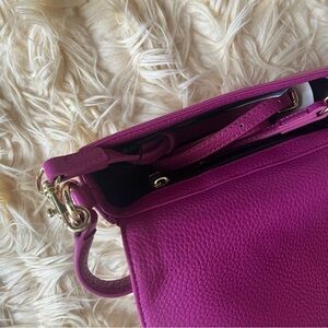 The Versace Jeans Collection crossbody bag showcases a stunning purple hue, complemented by luxurious gold-toned embellishments. Its compact design and textured finish make it a stylish and practical choice for any outing.
