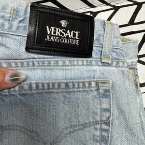 Elegant light denim jeans with signature Versace patch. Perfect for casual wear. Versace Jeans Couture Light Wash Bootcut Denim size 28- excellent condition!