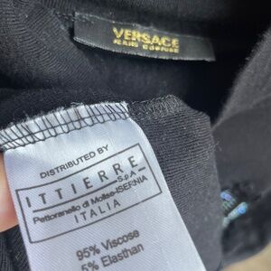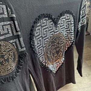 Absolutely stunning Versace Tunic long sleeve with heart logo with lace around heart and arm design. Shirt is decorated with sequence logos on arms and front multicolored and gold gems.