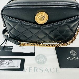 Authentic Versace La Medusa Small Crossbody Camera Bag in black quilted lambskin leather. Features the signature Medusa head plaque, gold-tone hardware, secure top zip closure, and an adjustable strap for versatile crossbody wear. Compact yet functional, perfect for everyday or evening looks. Made in Italy with exceptional craftsmanship.