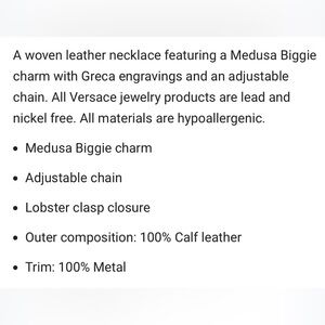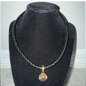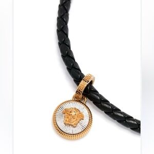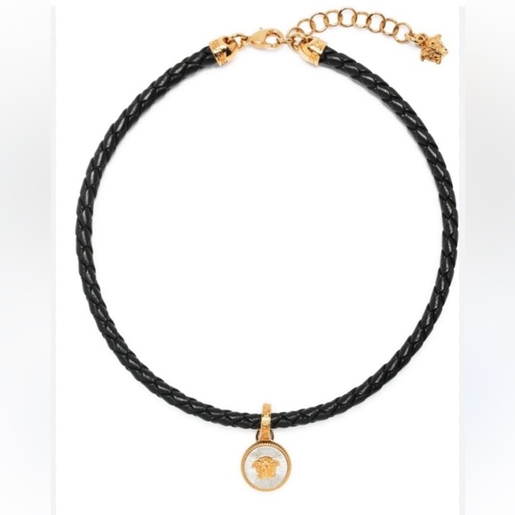 Braided black calf leather collar with mixed metals. Medusa plaque detail, lobster claw fastening gold tone hardware. Unisex.