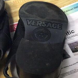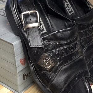 Really beautiful mens black leather Versace sandals, lovingly used in good shape! Each sandal has the infamous lionhead logo on gunmetal colored meta square in front of the buckle. Comes with Authenticate First certificate of authenticity.