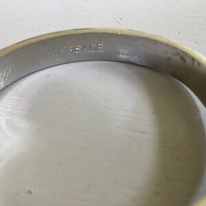 I am listing this as new as it has never been worn. Vintage and since I never wore it, will let someone else who can wear bangle bracelets. When I bought this years ago, it had said non tarnish, it is silver tone, but no markings of metal content. Versace Medusa bangle bracelet and logo. It is LESS than a 1/2" wide but more than 1/4" and when totally closed shut is 2.5" in diameter. Fit up to size 8 bracelet. Shiny and new. Sorry, original dust bag and box do NOT come with it. A great Christmas gift for someone special.