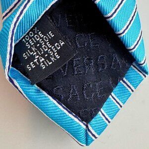 Authentic Versace Made in Italy 100% silk tie featuring the iconic Medusa head embroidered on a striking turquoise and white striped pattern. Crafted from premium woven silk with subtle sheen and impeccable Italian tailoring. There is one small, barely noticeable mark near the tip (see close-up photo), otherwise in excellent condition.