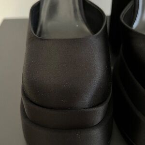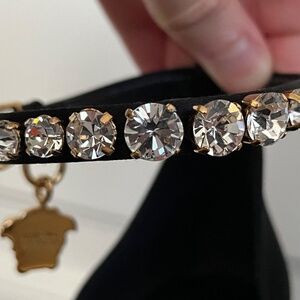 The shoes are the classic "Medusa Aevitas" square toe platform pumps in black satin. They have clear crystals at the adjustable ankle straps. They have the iconic Medusa head logo charm at one ankle strap in gold tone hardware. They have 6 1/2" chunky heels and 2 1/2" double platforms. Retail $1575.