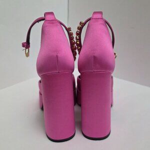 Versace's bold pumps are anchored by a towering platformed block heel. Crafted of soft satin in Italy, this statement pair features a dainty ankle strap adorned with lustrous crystals and a Medusa head charm. Perfect for upscale events, evening outings, or any occasion where you want to turn heads.