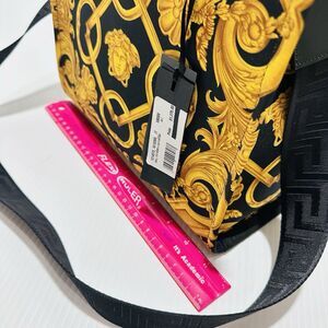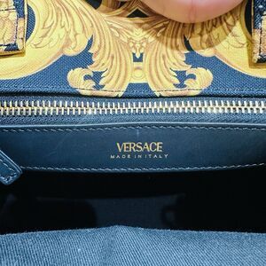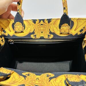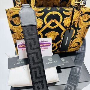 Elevate your style with this authentic Versace Medusa Medium Tote Bag, crafted in black and gold canvas cloth. The bag showcases the iconic Medusa prints, spacious interior, and the signature Greca shoulder strap for versatile wear. Perfectly sized for daily use, this luxury tote blends bold fashion with practical function.
