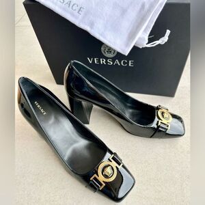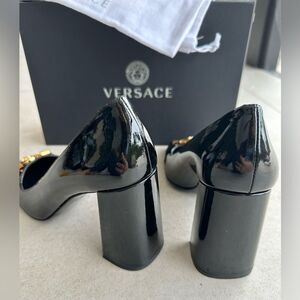 Versace Medusa Black Patent Leather Pumps Block Heels Size 37 NWT Brand new gorgeous Versace black patent leather pumps with full set-original box, dust bag. 85mm loafer-style pump with gold medusa coin hardware.