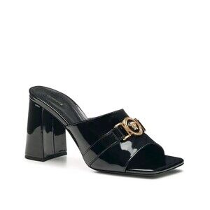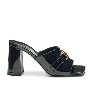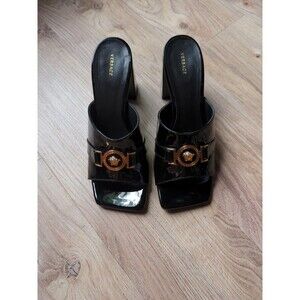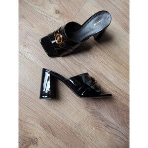 Versace Medusa Block Heel Square Toe Mule Black Patent Sandals Womens 8 EU 38