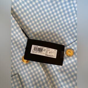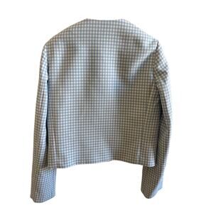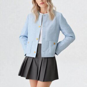 This chic Versace jacket features a stylish blue-and-white checkered fabric, finished with an elegant gold-tone button accent. Designed for a refined and feminine silhouette, this piece blends classic Versace detailing with a modern, tailored look. The structured style makes it perfect for both polished daytime outfits and elevated evening ensembles.