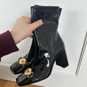 Versace Medusa Insignia Ankle Boots Square Toes Black Patent Leather Sz 38