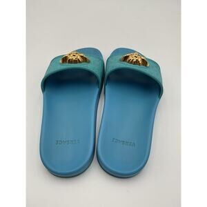 Versace 'Medusa' Blue Slides Size 9 US / EU 39: engraved rubber upper with rubber sole, made in italy, slip-on styling, gold-tone medusa head detail at upper.