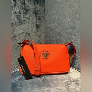 Add a bold touch of luxury with this Versace crossbody bag, crafted from supple leather in a vibrant orange hue. Featuring the iconic Medusa logo and gold-tone hardware, this structured silhouette blends elegance with functionality. Designed with an adjustable strap, it can be worn comfortably as a shoulder bag or crossbody, making it perfect for both day and evening occasions.