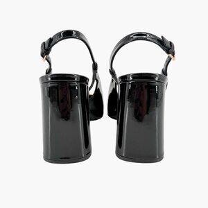 - Glossy black patent leather upper