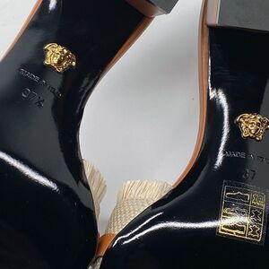 Versace's Medusa '95 raffia mules feature a woven raffia strap with fringe edges, a leather buckle with a Medusa ornament, and a 55MM block heel.