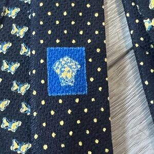 I can't tell if the inside of the butterflies are yellow or gold. Closer to yellow. There is also a blue outline over each butterfly. Main fabric is black.