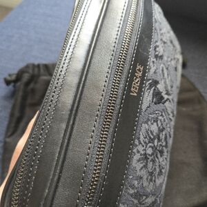 Crafted in Italy with luxe jacquard & leather trim. Features zip closure, detachable wrist strap, front zip pocket. Compact, stylish, and functional. great for travel or to carry every day!