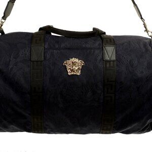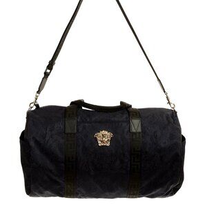 Versace Navy Heritage Print Silver Medusa Fabric Large Travel Gym Duffle Bag