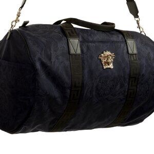 This is authentic Versace Navy Heritage Print Silver Medusa Fabric Large Travel Gym Duffle Bag