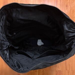 This Versace backpack showcases a sleek, minimalist design in a matte black finish, perfect for urban adventures. The roll-top closure and silver hardware accents add a touch of modern sophistication, making it a stylish yet functional choice for everyday use Stylish Versace backpack with sleek black design. Features blue strap accents. Perfect for modern fashion.