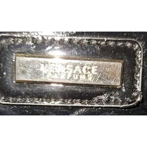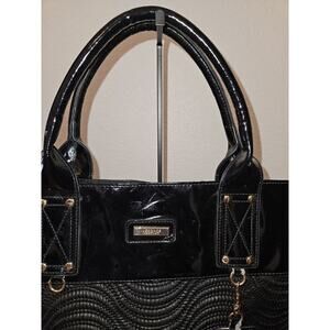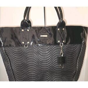 This Versace Perfume Large Tote Bag is an extra large bag with a solid pattern and black patent leather exterior. The bag features a magnetic closure, double handles, and measures 21 inches in width, 15 inches in height, and 3 inches in depth. The interior is lined with black fabric and includes inner pockets and pockets for additional storage. The bag is perfect for travel, casual outings, formal events, workwear, and business settings. The Versace logo accents the bag.