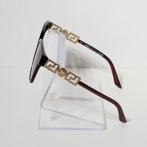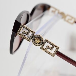 Polished metal temples adorned with iconic Medusa medallions, Greca detailing, and shimmering strass crystals add a luxurious sparkle. Pink gradient lenses enhance the chic design while offering advanced UVA/UVB protection. Flaunt an effortlessly opulent look with every wear.