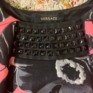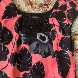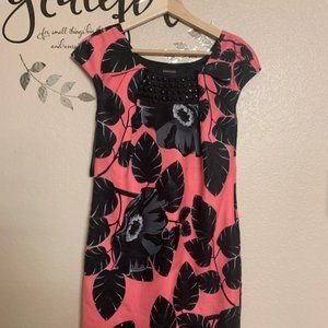Elegant pink dress with bold black floral pattern. Cap sleeves and fitted silhouette. Perfect for any occasion.