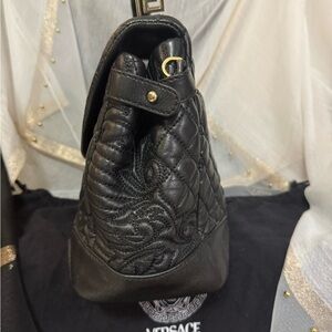This luxurious Versace shoulder bag features a striking quilted design in rich black leather, exuding sophistication and style. The structured silhouette is complemented by a gold-tone turn-lock closure, adding a touch of elegance. Perfect for any occasion, this bag is a timeless addition to your collection. Excellent condition. Authenticated with posh. Item sold as is. Open to offers