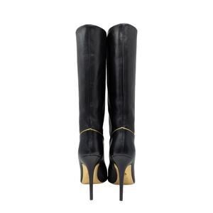 Beyonce, Cowboy Carter, Bella Hadid, vintage Italian designer western, Italian cowgirl, designer cowboy boots, luxury cowboy boots, Versace, knee-high boots, high heel boots, black leather, pointed toe, gold details, Medusa head, designer boots, luxury, vintage, embroidered, stiletto heel, women's boots, Italian made